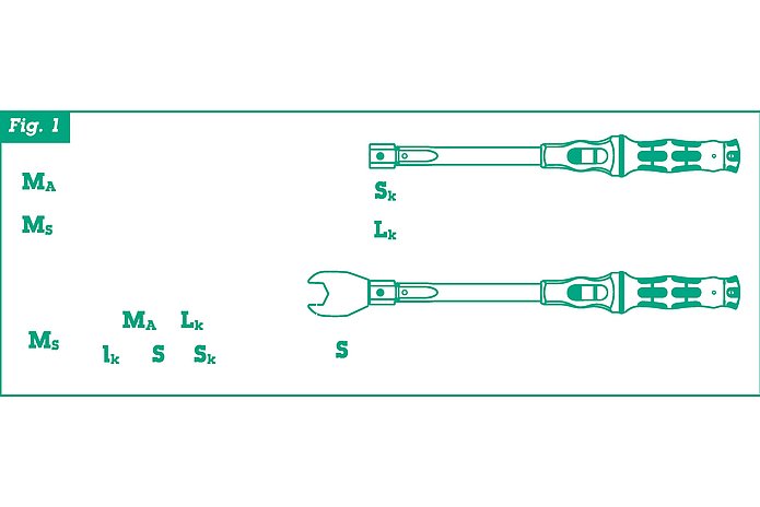 Welding should ideally be carried out by a specialist welding company. Strictly ensure good weldability of the part to be welded (e.g. material data sheet). The WERA welding adapter is made of a material similar to 46Cr2. Welding surfaces should be free of contamination (ideally prepared down to bare metal). Use the maximum possible welding surface of the adapter. Cool the material down after welding as slowly as possible (avoids stress cracks). If possible, apply stress relief annealing after welding. Generally suitable for all possible common welding processes: GTAW (gas tungsten arc welding) is preferred. The welding and subsequent use of the welded part is at the customer's own risk. Important information regarding change of length & drawing (Fig. 1) If the depth gauge of the shell tool you are using deviates from the length “Sk”, the actual release torque changes according to the formula shown (Fig.1).