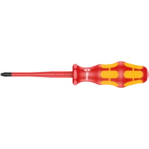 Wera VDE screwdriver with multi-component Kraftform handle for fast and smooth work: Hard handle zones for high working speeds, while soft handle zones guarantee a high torque transfer. Individually tested at 10,000 V for safe working at the approved voltage of 1,000 V. Reduced blade diameter, so that even sunken screws can be easily reached. Take it easy tool finder with colour coding by profile and size stamping - for quick and easy identification of the required tool . The hexagon anti-roll protection avoids screwdrivers from rolling away annoyingly at the workplace.