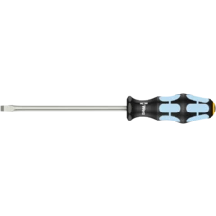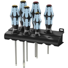 High quality Kraftform Plus screwdriver set out of stainless steel. The stainless tools from Wera are vacuum ice-hardened and have the hardness and strength needed for screw connections. They can be used for industrial application without hesitation. The Lasertip tip literally bites into the head of the screw and thereby prevents any slipping out of the screw head. Multi-component Kraftform handle for fast and low-fatigue working. Take it easy tool finder with colour coding according to profiles and size stamp - for simple and rapid accessing of the required tool. The hexagonal anti-roll feature prevents any bothersome rolling away at the workplace. Includes a practical rack for tidy storage of the screwdrivers.