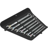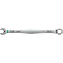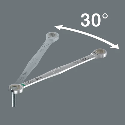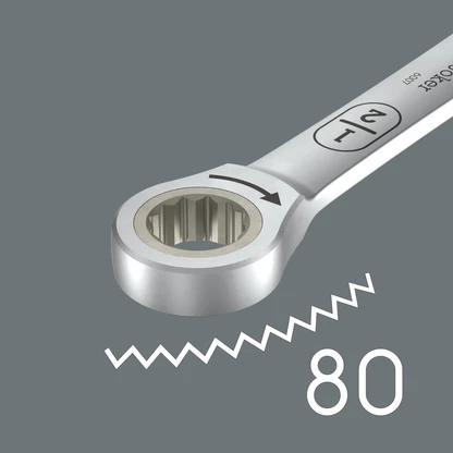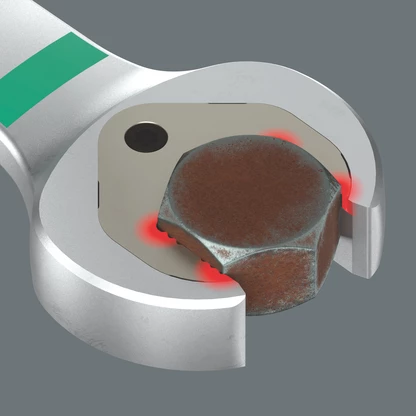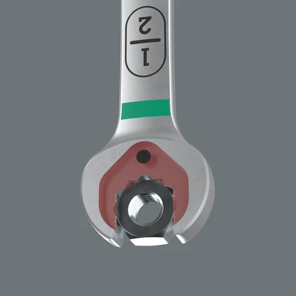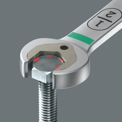 Brilliant combination of jaw end and ratchet mechanism at the ring end in a long design. Imperial sizes. For hexagon screw heads and bolts. The long lever allows for higher power transmission. The long design also improves accessibility at low-lying couplings. With holding function enabled by a metal plate in the mouth, which reduces the risk of losing screws and sockets. With its extra hard teeth, the exchangeable metal plate in the mouth secures screws and sockets and reduces the risk of slipping. The integrated end stop can prevent the screw head from slipping down and allows application of high torque transfer. The double hexagon geometry ensures a positive connection with the screw or bolt and thus reduces the risk of slipping. A return angle of only 30° at the jaw end avoids time-consuming rotating of the tool whilst screwdriving. Ratchet mechanism at the ring side with exceptionally high fine toothing of 80 teeth for flexibility even in confined spaces. The specially engineered geometry allows high torque transmission and high bending stiffness. Made of high-performance chromium molybdenum steel with nickel-chromium coating for high corrosion protection. With Take it easy tool finder: colour coding by size and extra laser-engraved size indication.