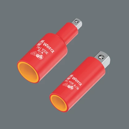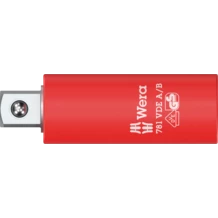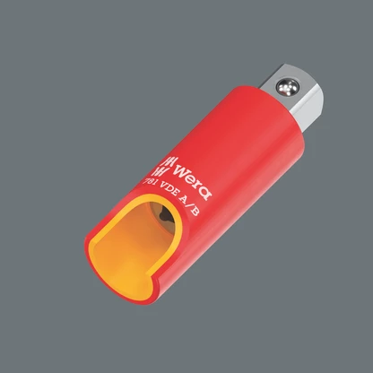 Connector from 1/4" square head socket to 3/8" external square head, with increased safety thanks to the yellow insulation core, which becomes visible if the outer red VDE insulation layer is damaged. Individually tested tool as per IEC 60900 at 10,000 V for safe working at the approved voltage of 1,000 V.