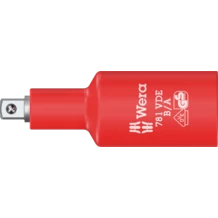 Connector from 3/8" square head socket to 1/4" external square head. With increased safety thanks to the yellow insulation core, which becomes visible if the outer red VDE insulation layer is damaged. Individually tested tool as per IEC 60900 at 10,000 V for safe working at the approved voltage of 1,000 V.