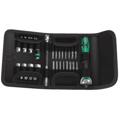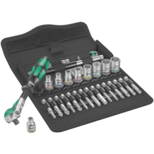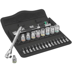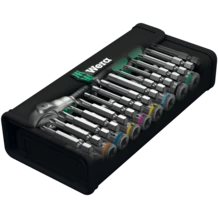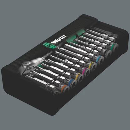 Incredibly compact set arrangement with many tools in a minimum of space. A completely new ratchet set feeling thanks to the unique textile boxes that are very robust and durable. They can be positioned upright for tidy storage on the workshop shelf. Additional surface protection due to textile outer material. Low weight and volume for simpler mobility. Take it easy Tool Finder with colour coding according to sizes.
