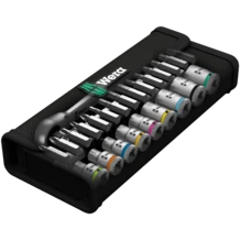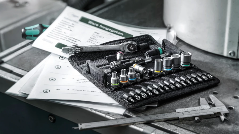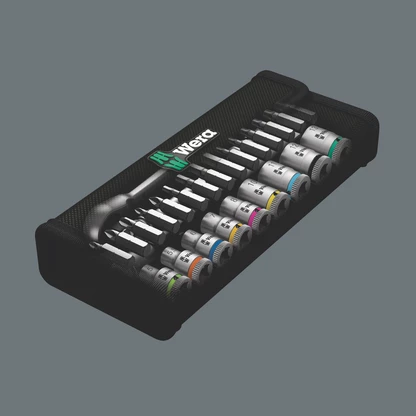 Incredibly compact set arrangement with many tools in a minimum of space. A completely new ratchet set feeling thanks to the unique textile boxes that are very robust and durable. They can be positioned upright for tidy storage on the workshop shelf. Additional surface protection due to textile outer material. Low weight and volume for simpler mobility. Take it easy Tool Finder with colour coding according to sizes.