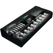 Incredibly compact set arrangement with many tools in a minimum of space. A completely new ratchet set feeling thanks to the unique textile boxes that are very robust and durable. They can be positioned upright for tidy storage on the workshop shelf. Additional surface protection due to textile outer material. Low weight and volume for simpler mobility. Take it easy Tool Finder with colour coding according to sizes.