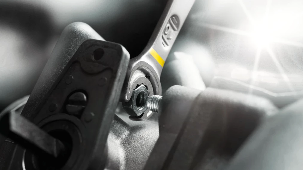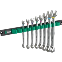 Ring ratchet spanner set, 8-piece set, imperial sizes; on a magnetic rail. The Joker 6000 ring ratchet spanner with holding function for hexagon screw heads and bolts. With its extra hard teeth, the exchangeable metal plate in the open end secures screws and sockets. The integrated end stop can prevent the screw head from slipping down and allows application of high torques. The double hexagon geometry ensures a positive connection with the screw or bolt and thus reduces the risk of slipping. A return angle of only 30° at the open end avoids time-consuming rotating of the wrench whilst screwdriving. Ratchet mechanism at the ring side with exceptionally high fine toothing of 80 teeth for flexibility even in confined spaces. The specially engineered geometry allows high torque transmission and high bending stiffness. Made of high-performance chromium molybdenum steel with nickel-chromium coating for high corrosion protection. With Take it easy Tool finder: Colour coding by size. The clips hold the tools perfectly. With its strong magnet, the rail holds securely to metal surfaces. It can also be bolted to the wall.