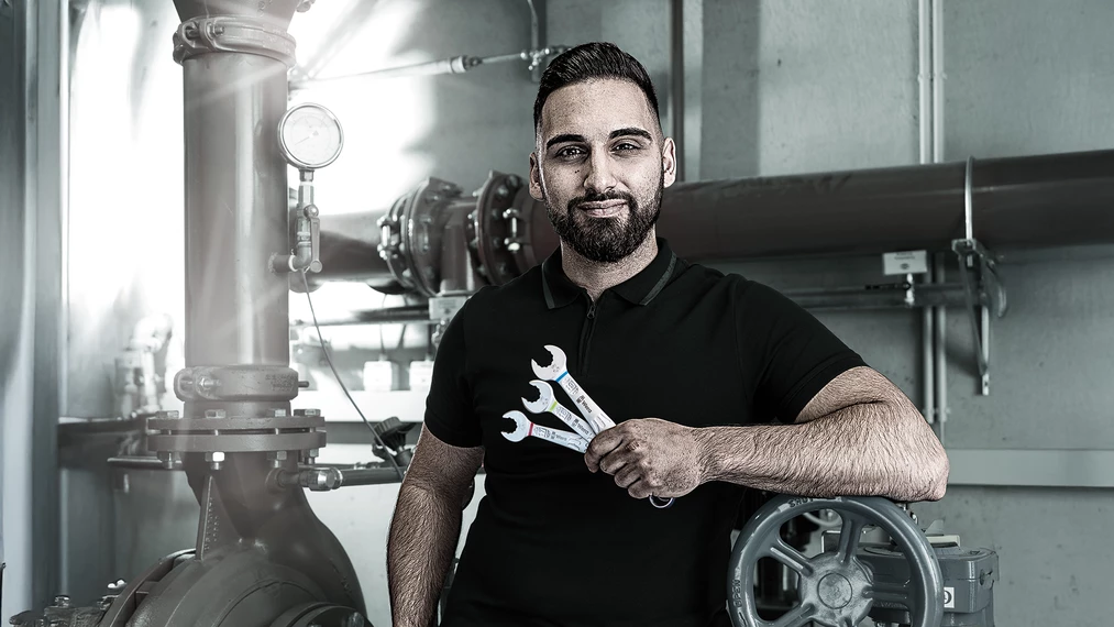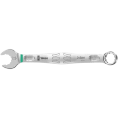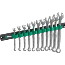 Ring spanner set, 11-piece set, metric sizes; on a magnetic rail. With the combination of the 7.5° offset open end and the double hexagon geometry, the Joker 6003 doubles the placement points. A repeated 180° turn of the wrench around the longitudinal axis during screwdriving provides four placement possibilities, and bolts or screw heads can be engaged every 15°. This makes screwdriving much easier, especially in confined spaces. The slim yet robust ring side is tilted by 15° to the tool axis. The high-quality surface treatment achieves a high and long-lasting corrosion protection. With Take it easy Tool finder: Colour coding by size. The clips hold the tools perfectly. With its strong magnet, the rail holds securely to metal surfaces. It can also be bolted to the wall.
