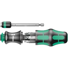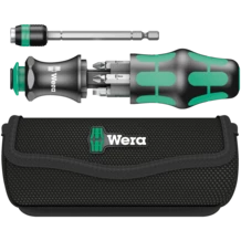 Wera compact tools enable both manual as well as power tool operations at the same time. The handle/interchangeable blade system in a compact design with various blade tips in the smallest of spaces makes the user more mobile and flexible. Suitable for bits with ¼" hexagon head drive as per DIN ISO 1173-C 6.3 and E 6.3 (ISO 1173) and Wera connecting series 1 and 4. Comes with an adaptor, bayonet and Rapidaptor technology. Kraftform handle with anti-roll feature, multi-component for particularly ergonomic screwdriving. Integrated magazine for bit storage. In this way, the set replaces a 6-piece screwdriver set and reduces the equipment required to a minimum. The telescopic bayonet blade - which can be lowered into the handle - together with the quick-release chuck allows fast manual work even in confined installation situations when the blade is retracted. The blade can be extended by simply actuating the locking sleeve. The bayonet holder can then be used as a fully-fledged screwdriver. The bayonet blade can be removed and used as a power tool adaptor, but can also be retracted once again to its original position. Includes practical belt pouch.