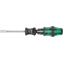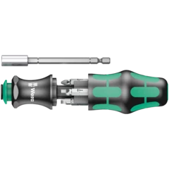 Wera compact tool with multi-component Kraftform handle for high working speeds and particularly ergonomic screwdriving. Bit magazine integrated in the handle, 6 tough bits for universal use. Bit holder with strong permanent magnet for secure seating of the bit.