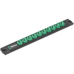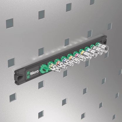 Socket rail with 9 manual and machine sockets (non-impact), 1/4". A smooth rotary mechanism allows a secure hold and easy access of the sockets. With Take it easy tool finder with colour coding by size - to help you find the required tool quickly and easily. The rail allows temporary attachment to metallic surfaces and, with its twist-to-unlock function, ensures secure locking and unlocking of the sockets.