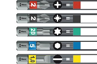 New Wera “Take it Easy” tool finder / Coloured sleeves clearly indicate the profile type of screwdriver bits / Additional stamping for easy size…