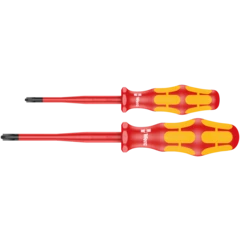 7-piece screwdriver set with reduced shaft diameter and integrated insulation protection so that even low-lying screw and spring elements can be accessed and actuated. Kraftform Plus handle for pleasant, ergonomic working that makes blisters and calluses a thing of the past. Hard gripping zones for high working speeds whereas soft zones ensure high torque transfer. Take it easy Tool Finder: colour coding according to profile and size. The anti-roll feature prevents any bothersome rolling away at the workplace. Including single-pole phase tester and 1 rack for storage.