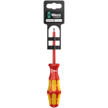 Wera VDE screwdrivers with multi-component Kraftform Plus handle for fast and low-fatigue working: hard gripping zones for high working speeds whereas soft zones ensure high torque transfer. Combination profile - slotted and Pozidriv* particularly for jobs on terminal blocks, fuse boxes, switches and relays. Individually tested in water bath at 10,000 volts for secure work at the permissible voltage of 1,000 volts. The hexagonal anti-roll feature prevents any bothersome rolling away at the workplace.