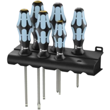 High quality Kraftform Plus screwdriver set out of stainless steel. The stainless tools from Wera are vacuum ice-hardened and have the hardness and strength needed for screw connections. They can be used for industrial application without hesitation. The Lasertip tip literally bites into the head of the screw and thereby prevents any slipping out of the screw head. Multi-component Kraftform handle for fast and low-fatigue working. Take it easy tool finder with colour coding according to profiles and size stamp - for simple and rapid accessing of the required tool. The hexagonal anti-roll feature prevents any bothersome rolling away at the workplace. Includes a practical rack for tidy storage of the screwdrivers.