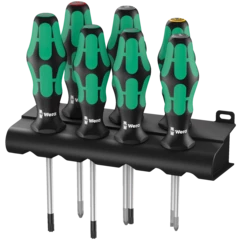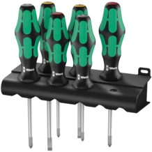6-piece screwdriver set with Kraftform Plus handle for pleasant, ergonomic working that prevents blisters and calluses. Hard gripping zones for high working speeds whereas soft zones ensure high torque transfer. The Lasertip tip literally bites into the head of the screw and thereby prevents any slipping out of the screw head. Take it easy Tool Finder: colour coding according to profile and size. The hexagonal anti-roll feature prevents any bothersome rolling away at the workplace. Includes practical rack for tidy storage of the screwdrivers.