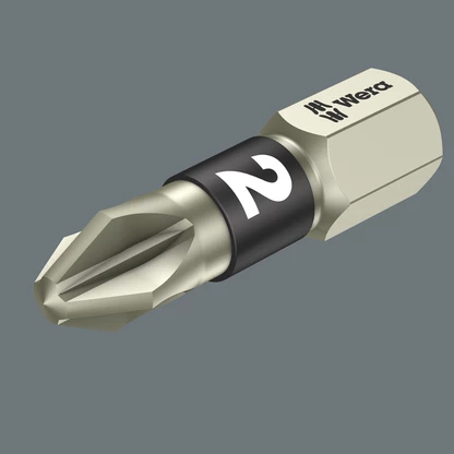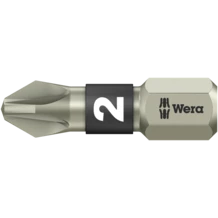 High quality bits out of stainless steel for Pozidriv screws. Wera stainless are made out of stainless steel which prevents the formation of unsightly extraneous rust. Come with Torsion zone: Torsion bits take-up torque peaks and absorb them in the Torsion zone. This prevents premature wear and extends the service life of the bit. ¼" hexagon, suitable for holders as per DIN ISO 1173-D 6.3.