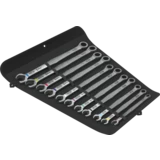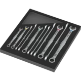 Unique combination of jaw and ring ratchet mechanism in a long design. For hexagon screw heads and bolts. The long lever allows for higher power transmission. The long design also improves accessibility at low-lying couplings. With holding function enabled by a metal plate in the mouth, which reduces the risk of losing screws and sockets. With its extra hard teeth, the exchangeable metal plate in the mouth secures screws and sockets and reduces the risk of slipping. The integrated end stop can prevent the screw head from slipping down and allows application of high torques. The double hexagon geometry ensures a positive connection with the screw or bolt and thus reduces the risk of slipping. A return angle of only 30° at the jaw end avoids time-consuming rotating of the tool whilst screwdriving. Ratchet mechanism at the ring side with exceptionally high fine toothing of 80 teeth for flexibility even in confined spaces. The specially engineered geometry allows high torque transmission and high bending stiffness. Made of high-performance chromium molybdenum steel with nickel-chromium coating for high corrosion protection. With Take it easy tool finder: colour coding by size and extra laser-engraved size indication.