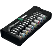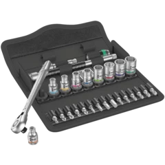 Incredibly compact set arrangement with many tools in a minimum of space. A completely new ratchet set feeling thanks to the unique textile boxes that are very robust and durable. They can be positioned upright for tidy storage on the workshop shelf. Additional surface protection due to textile outer material. Low weight and volume for simpler mobility. Take it easy Tool Finder with colour coding according to sizes.