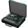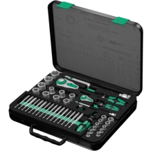 43-piece Zyklop set in robust metal case: Zyklop ratchet with 1/4"drive and Zyklop ratchet with 1/4"drive. The 72 fine-pitched teeth enable a low return angle of only 5°. The ratchet head pivots freely and can be locked into any position by using the slide switch that is positioned on either side. It is even possible to work conveniently in very confined and difficult-to-access areas with enhanced hand clearance. The predefined locking positions at 0°, 15° und 90°, both to the right and left, ensure safe working without any slipping of the ratchet head. The ratchet can be used as a conventional screwdriver in the 0° position by attaching an adaptor and a bit. The flywheel design ensures rapid screwdriving. The rotation-symmetric construction of the Kraftform handle and the free-turning sleeve support rapid twisting. The outstanding design of the Kraftform handle fits perfectly into the hand preventing hand injuries such as blisters and calluses. The hard materials used for the handle ensure quick and easy hand repositioning without any danger of the skin "sticking" to the handle. The softer anti-slip zones enable the low-loss transfer of high torque. For 1/4" square sockets as well as 1/4" adaptors with square drive, equipped with ball lock. Including 21 Zyklop sockets, 2 Zyklop extensions with free-turning sleeve, 1 Kraftform bit holder with quick-release chuck, 16 bits. Take it easy Tool Finder with colour coding according to sizes.