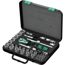 43-piece Zyklop set in robust metal case: Zyklop ratchet with 3/8"drive. The 72 fine-pitched teeth enable a low return angle of only 5°. The ratchet head pivots freely and can be locked into any position by using the slide switch that is positioned on either side. It is even possible to work conveniently in very confined and difficult-to-access areas with enhanced hand clearance. The predefined locking positions at 0°, 15° und 90°, both to the right and left, ensure safe working without any slipping of the ratchet head. The ratchet can be used as a conventional screwdriver in the 0° position by attaching an adaptor and a bit. The flywheel design ensures rapid screwdriving. The rotation-symmetric construction of the Kraftform handle and the free-turning sleeve support rapid twisting. The outstanding design of the Kraftform handle fits perfectly into the hand preventing hand injuries such as blisters and calluses. The hard materials used for the handle ensure quick and easy hand repositioning without any danger of the skin "sticking" to the handle. The softer anti-slip zones enable the low-loss transfer of high torque. For 3/8" square sockets as well as 3/8" adaptors with square drive, equipped with ball lock. Including 18 Zyklop sockets, 2 Zyklop extensions with free-turning sleeve, 1 T-handle, 1 "Wobble" extension, 1 universal joint, 1 adaptor with quick-release chuck, 18 bits. Take it easy Tool Finder with colour coding according to sizes.