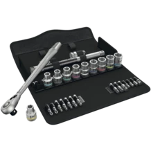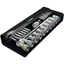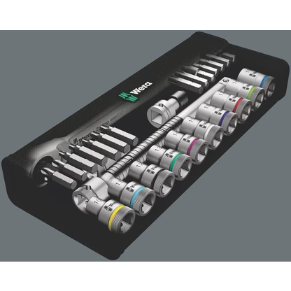 Incredibly compact set arrangement with many tools in a minimum of space. A completely new ratchet set feeling thanks to the unique textile boxes that are very robust and durable. They can be positioned upright for tidy storage on the workshop shelf. Additional surface protection due to textile outer material. Low weight and volume for simpler mobility. Take it easy Tool Finder with colour coding according to sizes.