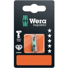 High quality bits for recessed TORX® screws. The Impaktor technology offers an above-average service life even under extreme circumstances. Enhanced friction resistance, thanks to the rough diamond-particle coating on the bit tip, prevents any slipping out of the screw head. Particularly suitable for use with customary impact drivers. ¼" hexagon, suitable for holders as per DIN ISO 1173-D 6.3.