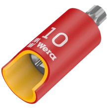 VDE ⅜" bit socket with increased safety due to yellow insulation core, which becomes visible in case of damage to the outer red VDE insulation layer. Individually tested tool as per IEC 60900 at 10,000 V for safe working at the approved voltage of 1,000 V. With Take it easy tool finder with colour coding by size - for easy and quick location of the required tool.