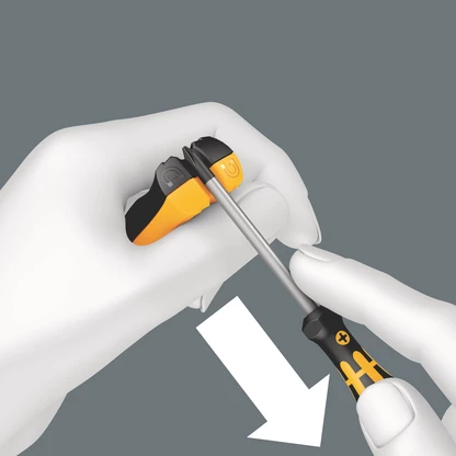 ESD-safe tool thanks to surface resistance of ≤ 109 Ohm. Simply pull the tool along the positive side of the Wera magnetiser and the tool will hold the screw securely on the blade. To demagnetise, move the tool along the negative side.