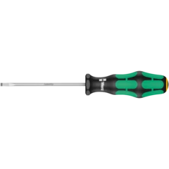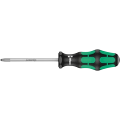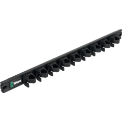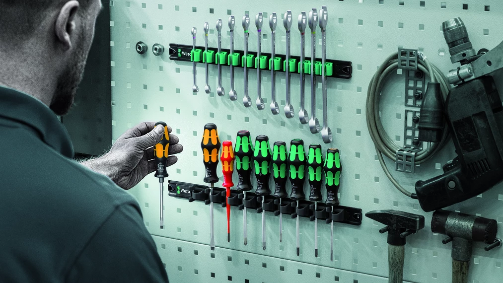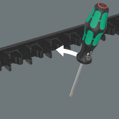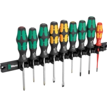 Kraftform screwdriver set, 9-piece set, on a magnetic rail. Screwdriver all-round set. Kraftform Plus handle for comfortable ergonomic screwdriving, avoiding blisters and calluses. Hard handle zones for high working speeds, while soft handle zones guarantee a high torque transfer. 932 A with pound-thru hexagonal blade and impact cap; 350, 355 and 335 with Lasertip: The tips of Wera Lasertip screwdrivers are microscopically roughened with laser beams. This rough surface "bites" into the screw head and unintentional slipping is a thing of the past. 160 iS VDE-insulated and with Lasertip. Take it easy tool finder with colour coding by profile and size stamping - for quick and easy identification of the required tool. The clips hold the tools perfectly. With its strong magnet, the rail holds securely to metal surfaces. It can also be bolted to the wall.