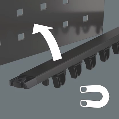 - With its strong magnet, the rail holds securely to metal surfaces. It can also be bolted to the wall.