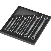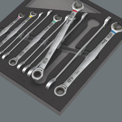 Durable foam insert; two-coloured for quick identification of missing parts; suitable for the Tool Rebel roller cabinets. Equipped with 11 long 6007 Joker ratcheting combination wrenches.