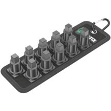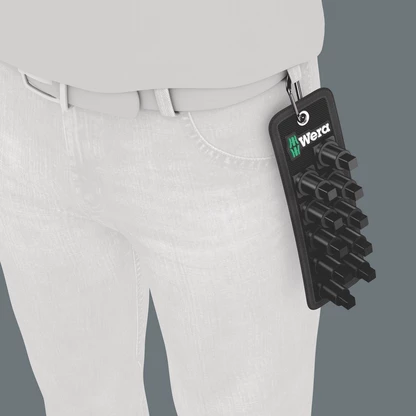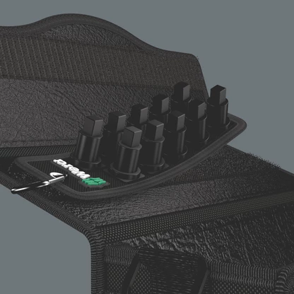 Robust textile belt in the typical Wera design for up to 10 VDE sockets (⅜") in the tightest of spaces. A smooth Smooth Twist to Unlock mechanism ensures a secure grip and easy removal of the sockets. Including snap hooks for attaching to belt loops or bags. Fleece back and hook and loop fastener strips for easy attachment e.g. to wall, shelf, workshop trolley and Wera 2go tool transport system.