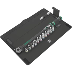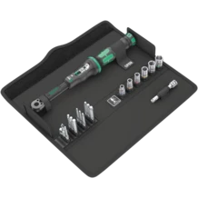 Click torque wrench in the unmistakable Wera design. Very robust design with high accuracy as per DIN EN ISO 6789-1: 2017-07. Easy setting and saving of the default value. The audible and tactile clicks on reaching the scale values facilitate the safe setting of the desired torque value. The robust release mechanism guarantees a clearly audible and tactile release signal when the set torque is reached. Provides clockwise torque-control and 45-tooth ratchet mechanism. The Wera click torque wrench is accompanied with various accessories in a compact set arrangement. Included are: Click-Torque A 6 1/4" from 2.5 to 25 Nm, 6 sockets with 1/4" drive, 11 Hex-Plus hexagon bits, Philips head bits and TORX® bits, plus an extension and socket adaptor.