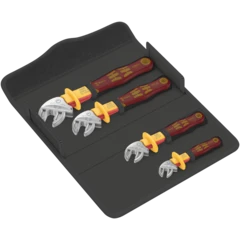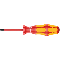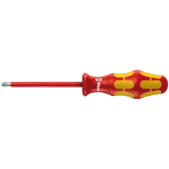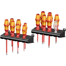 14-piece screwdriver set with individually tested, insulated screwdrivers as per IEC 60900. Individual testing at 10,000 volts so as to ensure safe working at the permitted voltage of 1,000 volts. Kraftform Plus handle for pleasant, ergonomic working that prevents blisters and calluses. Hard gripping zones for high working speeds whereas soft zones ensure high torque transfer. Partially Lasertip: the tip literally bites into the head of the screw and thereby prevents any slipping out of the screw head. Includes voltage tester and 2 racks for storage. Take it easy Tool Finder: colour coding according to profile and size. The anti-roll feature prevents any bothersome rolling away at the workplace. Including single-pole phase tester and 2 racks for storage.