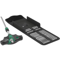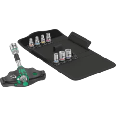 9-piece set in a robust textile box. One 411 A RA T-handle adapter screwdriver with ratchet functionality for 1/4" sockets. The integrated ratchet with fine toothing (80 teeth/return angle 4.5°) eases and accelerates screwdriving without having to reposition the tool. The ratchet mechanism completely embedded in the handle ensures very handy and comfortable work. With reversing lever for comfortable clockwise/counterclockwise direction change in one-hand operation. The ergonomic shape of the handle fills the ball of the hand well, the fingers lie securely in the softly rounded recessed grips. The whole hand comes into contact with the handle, friction loss between hand and handle is avoided. For 1/4" sockets as well as 1/4" connectors with square head drive, with ball lock. 8 Zyklop sockets with 1/4" drive. Take it easy tool finder: With colour coding by size - for quick and easy identification of the required tool .