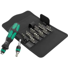 32-piece set with 816 R Kraftform bitholding screwdriver with Rapidaptor quick-release chuck and multi-component Kraftform handle for fatigue-free working. Rapidaptor universal holder with strong permanent magnet, which even holds big and heavy screws. Throw in the 30 bits and the user is equipped for almost every application. In a robust textile box; compatible with Wera 2go.