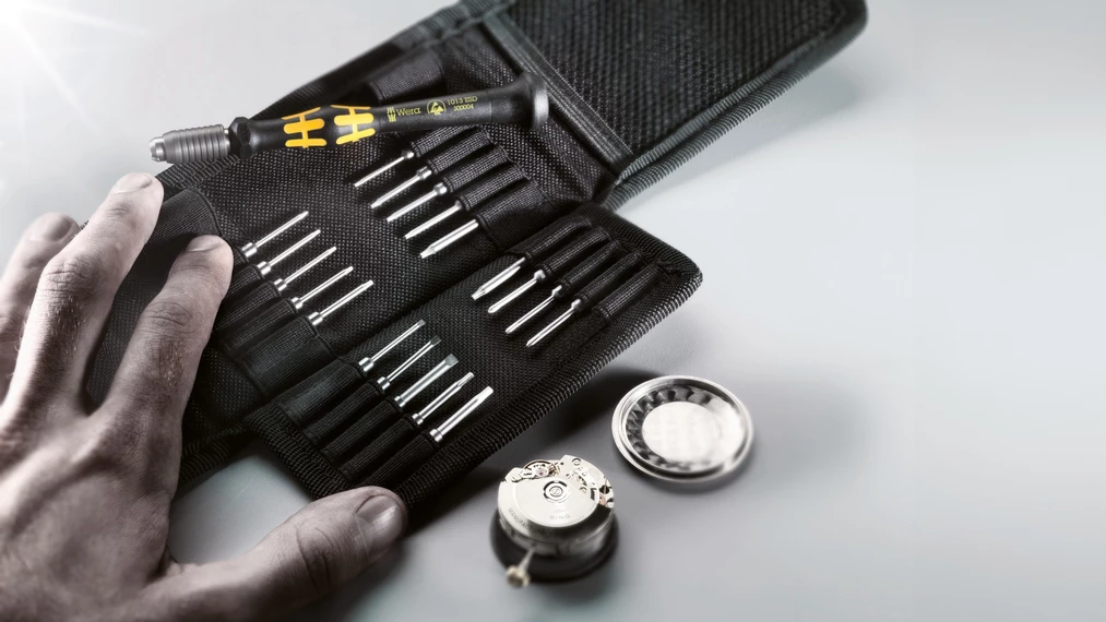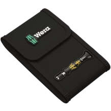 Kraftform Kompakt Micro set for precision mechanical work. Suitable for the take-up of bits with 4 mm halfmoon drive (Wera series 9) and bits with 4 mm HIOS drive (Wera series 21). Electrical surface resistance of ≤ 109 Ohm for secure protection against electrostatic charge. Manufactured in accordance with DIN EN 61340-5-1. Compact handle/interchangeable blade system for fast blade change. Kaftform Micro handle with twist cap and free-turning zone for rapid twisting, making any time-consuming repositioning of the fingers unnecessary. Power zone with integrated soft zones for the transfer of higher tightening and loosening torque. Precision zone directly above the blade for the right angle for adjustment work. Bits for manual as well as power tool operations. Rapid fixing of the bit: just push the bit into the insert for automatic locking and a secure fit. To change the bit, simply push the sleeve forward and remove. Free-turning sleeve for simple guidance of the tool during the screwdriving process.