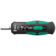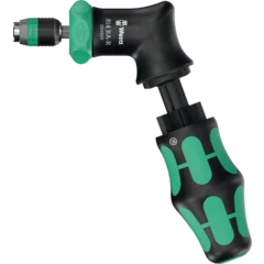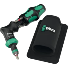 Kraftform pistol handle for 1/4" hex drive bits. The ratchet with fine toothing integrated in the handle allows fast working. Switching the screwdriving direction is intuitive: Turn the ring switch clockwise for clockwise screwdriving, turn it counterclockwise for counterclockwise screwdriving. Use position 0 to deactivate the ratchet mechanism for precise working. The Rapidaptor technology of the bitholding screwdriver makes for a quick bit change. Includes 6 BiTorsion bits for a long product life, tough, for universal use; stored in the bit magazine integrated in the handle. The strong permanent magnet in the 1/4" bit mounting ensures secure holding of the bit. The 2-component Kraftform pistol handle allows for high leverage. The robust holster can be attached to the belt.
