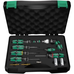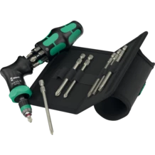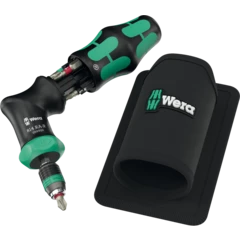 Kraftform pistol handle for 1/4" hex drive bits. The ratchet with fine toothing integrated in the handle allows fast working. Switching the screwdriving direction is intuitive: Turn the ring switch clockwise for clockwise screwdriving, turn it counterclockwise for counterclockwise screwdriving. Use position 0 to deactivate the ratchet mechanism for precise working. The Rapidaptor technology of the bitholding screwdriver makes for a quick bit change. Includes 6 BiTorsion bits (25 mm) for a long product life, tough, for universal use; stored in the bit magazine integrated in the handle. 6 tough bits (89 mm) for universal use. The strong permanent magnet in the 1/4" bit mounting ensures secure holding of the bit. The 2-component Kraftform pistol handle allows for high leverage. The robust holster can be attached to the belt.