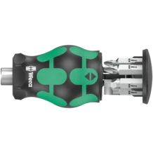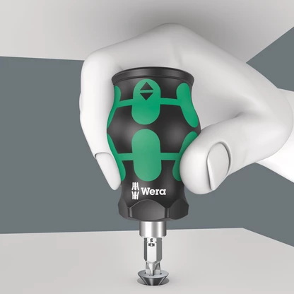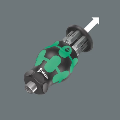 Particularly small bitholding screwdriver with short bit mounting for hard to reach areas. Includes 6 bits, which are located in a magazine in the handle. With only 65mm total length, the Kraftform Kompakt Stubby is a real mini screwdriving workshop. The strong permanent magnet in the bit mounting ensures secure holding of the bit. The 2-component handle with the practical combination of hard and soft zones allows for a firm grip and precise working. Tough viscous bits for universal use.