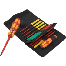 17-piece Kraftform Kompakt VDE set. One 837 i RA bladeholding screwdriver with ratchet functionality (40 teeth, 9° return angle), one 817 VDE bitholding screwdriver, 15 VDE blades with Take it easy Tool finder: Colour coding by profile and laser-engraved size indication. Individually tested tools as per IEC 60900. Individually tested in a water quench at 10,000 V for safe working at the approved voltage of 1,000 V. In a robust belt pouch.