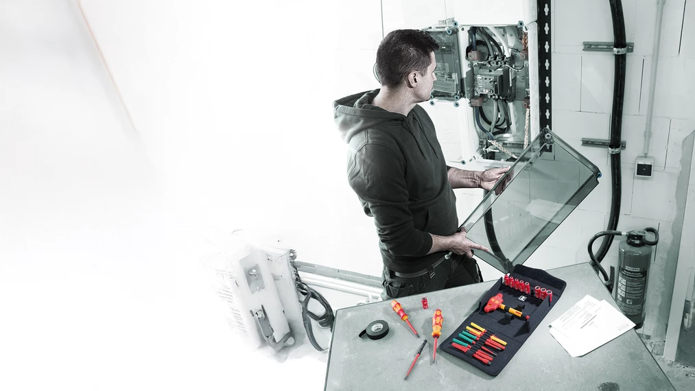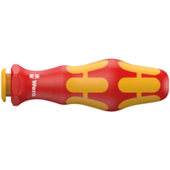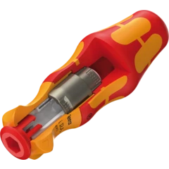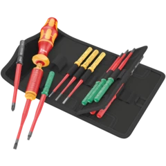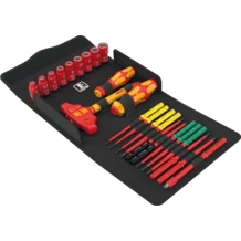 The all-rounder set for VDE applications. Two bitholding screwdrivers 837 i RA and 817 VDE for Kraftform Kompakt VDE blades (837 i RA with ratchet functionality for accelerated screwdriving). 11 Kraftform Kompakt blades for slotted screws, Phillips-head screws (Phillips and Pozidriv) and TORX® screws. Even low-lying screw and spring elements can be reached thanks to the reduced blade diameter. The Take it easy tool finder (colour coding by profile as well as laser-engraved size indication) makes it easy to reach for the required blade. One T-handle with ratchet functionality for 1/4" sockets. The recesses in the fast-rotating sleeve on the blade allow resistance to be generated by finger force which allows the ratchet mechanism to be used even at low resistance of the screw. 9 sockets offer increased safety thanks to the 2-component insulation with a yellow insulation core under an outer red insulation layer. The inner yellow insulation layer becomes visible if the outer red VDE insulation layer is damaged. All tools are individually tested at 10,000 Volt as per IEC 60900. Space-saving and safe storage in a textile box. The textile box can be docked directly onto the Wera 2go transport system or attached to the workshop trolley, tool wall, etc with the included hook and loop fastener strip.