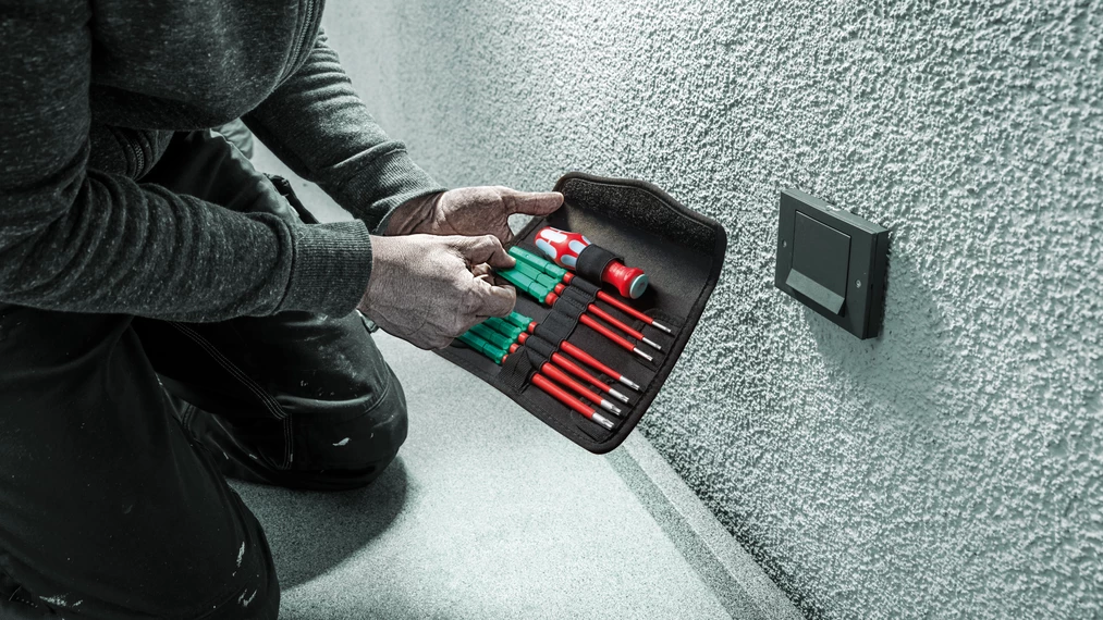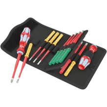 2x 3817 Kraftform VDE bladeholding screwdrivers for ergonomic screwdriving. 15 VDE stainless blades, some of which with reduced blade diameter (iS), so that even low-lying screw and spring elements can be easily reached and operated; with Take it easy Tool finder: Colour coding by profile and laser-engraved size indication - for quick and easy identification of the required tool. Individually tested at 10,000 V for safe working at the approved voltage of 1,000 V. Wera's stainless steel tools are vacuum ice tempered and therefore have the hardness and strength properties required for screw connections. Industrial use is possible without restrictions. In a robust belt pouch. The pouch is suitable for attachment to walls, shelves, workshop trolleys and the Wera 2go system thanks to the hook and loop fastener system on the back.