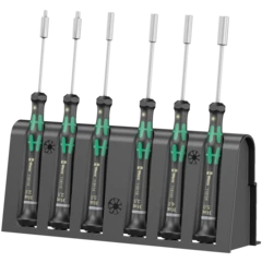 Wera Micro screwdriver set for precision mechanical work. Rapid twisting results from fixing the hand on the head and using the fast-turning zone just below. This makes time-consuming grip adjustments unnecessary. Storage and transport in a robust belt pouch - so the tool is always at hand.