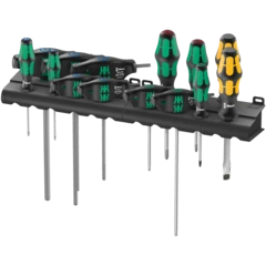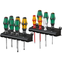 12-piece all-round screwdriver set. Kraftform Plus handle for pleasant, ergonomic working that prevents blisters and calluses. Hard gripping zones for high working speeds whereas soft zones ensure high torque transfer. Partially with Lasertip: The tips of the Wera Lasertip screwdrivers are microscopically roughened by laser beams. This rough surface literally bites into the head of the screw. Any unintentional slipping out is therefore a thing of the past. Take it easy tool finder with colour coding according to profiles and size stamp - for simple and rapid accessing of the required tool.