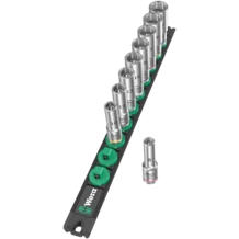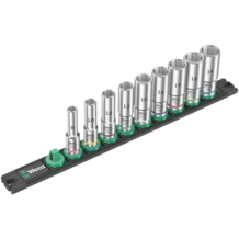 Socket rail with 9 long manual and machine sockets (non-impact), 3/8". A smooth rotary mechanism allows a secure hold and easy access of the sockets. Long 3/8" manual and machine sockets (ISO 2725 part 3) by Wera for manual and (non-impact) machine use even at low lying couplings and protruding thread rods. With Take it easy tool finder with colour coding by size - to help you find the required tool quickly and easily. Slip-proof for easy grip even with oily hands. With hexagon profile and ball stop groove. The hexagon profile enables the transmission of high forces and loads the edges of the bolt or the screw head less than a double hexagon profile. Fine-teethed ratchets also make use of a double hexagon profile superfluous, even in confined spaces, thanks to their small return angle. For external hexagon bolts and screws. The rail allows temporary attachment to metallic surfaces and, with its twist-to-unlock function, ensures secure locking and unlocking of the sockets.