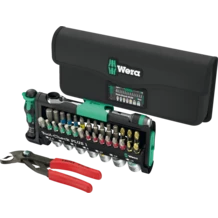 40-piece set. Very compact tool set for manual and machine use. The green locking components of the Tool-Check secure the tools during transport. Includes one 1/4" bit ratchet in drop-forged solid steel design. Fine toothing mechanism (60 teeth) for a small return angle of 6° for precise working. Easy clockwise/counterclockwise switching. Ergonomically shaped ratchet head and lever. 1/4" sockets can also be used with the Wera 870/1 adapter (1/4" external hexagon to 1/4" external square head) included in the set. 7 Zyklop sockets (1/4") for manual and machine-operated tools; with ball stop groove. Knurling at the rear end for manageability during manual screwdriving. With Take it easy tool finder: colour coding by size - for quick and easy identification of the required tool. Made of matte chrome-plated chrome-vanadium. 28 bits, BTZ and BTH design with BiTorsion zone (prevents the bit from breaking prematurely) and Take it easy toolfinder: colour coding by profile and size, tough design (Z) for universal use, Phillips and Pozidriv, TORX®, TORX® BO, slotted and hexagonal socket. 1x KNIPEX Cobra® 87 01 125 high-tech water pump pliers. In the very compact, functional Tool-Check. One robust pouch.