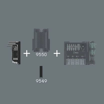 The Tool-Check Modular system offers the possibility of combining Tool-Check Modular products in a super-compact manner depending on requirements. All you need is the rigid adapter 9549 included in the set. The Tool-Check Modular products can be combined, exchanged or expanded at any time. A flexible connection, which can be folded up, is also possible with the flexible hinge 9550 (not included).