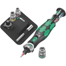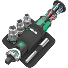 18-piece set; 1 Zyklop Pocket 8009 for 3/8" sockets as well as 3/8" connectors with square head drive; also suitable for bits with 1/4" external hexagon drive as per DIN ISO 1173-C 6.3 and E 6.3 and Wera connection series 1 and 4. 3/8" ratchet and 1/4" bit ratchet screwdriver; freely swivelling ratchet head; pre-defined positions at 0°, 15° and 90° to the left and right; can be used as a conventional screwdriver in the 0° position; clockwise/counterclockwise switching, fine-toothed, small return angle of 5°; magnetic direct mounting. Multi-component Kraftform handle for fatigue-free working; captive, freely swivelling magazine with 12 bits integrated in the handle, 1/4", 25 mm length; one universal holder (75 mm length) with stainless steel sleeve and strong permanent magnet, suitable for mounting bits with 1/4" external hexagon drive as per DIN ISO 1173-C 6.3 and Wera connection series 1; 3 Zyklop sockets, 3/8"; one robust textile tool holster 9468, can be attached to the belt and docked onto the Wera 2go system.