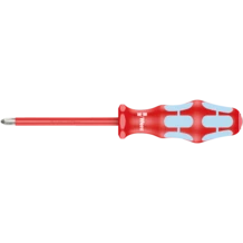 Destornillador de alta calidad Kraftform Plus VDE de acero inoxidable. Las herramientas de acero inoxidable de Wera se elaboran con ayuda del método de endurecimiento de congelación al vacío y disponen así de los valores de dureza y resistencia que se necesitan para uniones atornilladas. La aplicación industrial es posible sin ninguna clase de limitaciones. La prueba individual de los destornilladores Kraftform Stainless VDE se realiza a 10.000 V según DIN EN 60900 (IEC 60900) y garantiza así un trabajo seguro bajo tensiones hasta los 1.000 V. Incluso bajo condiciones de aplicación extremas se garantiza la seguridad gracias a la resistencia de impacto en frío de hasta -40° C. El mango es tipo Kraftform multicomponente para un trabajo agradable y ergonómico. Con sistema de búsqueda de herramienta Take it easy: marcas de color según el perfil y sellos con el tamaño. El sistema de protección contra el rodamiento evita las molestias que conlleva el perder la herramienta que se rueda en el puesto de trabajo.
